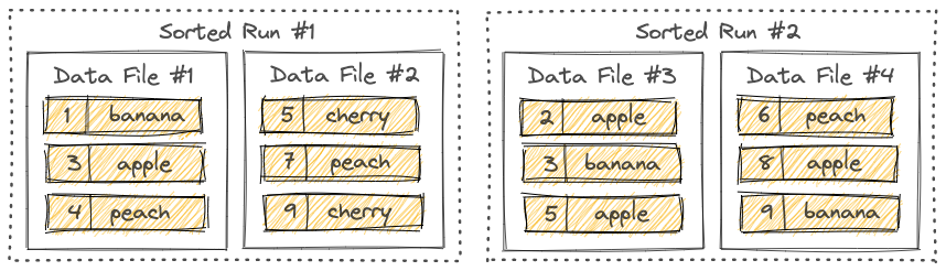 LSM tree organizes files into several sorted runs. A sorted run consists of one or multiple data files and each data file belongs to exactly one sorted run.
